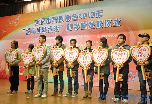 自2011年北京市慈善协会在我校设立“爱心成就未来”助学项目以来,我校坚持做好助学款的评审、发放工作,帮助困难学生安心读书,完成学业,追求理想。到目前为止,已有280名家庭经济困难学生获得资助。此次助学款发放仪式鼓励了参会大学生以健康、阳光的心态,正确选择自己的人生之路,努力实现自己的梦想,实现中国梦,并将爱心传递下去。